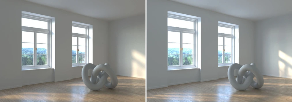 Kolejną rzeczą, którą warto zazwyczaj zmienić jest Size w parametrach słońca. Domyślna wartość 1 daje bardzo ostre cienie, które raczej rzadko kiedy chcemy uzyskać. Poniżej po lewej stronie możecie zobaczyć render z Size ustawionym na wartość 10. Jeśli chcemy jeszcze bardziej urozmaicić nasze cienie, to za oknem możemy dodać jakieś drzewa lub zwykłe tekstury z kanałem Opacity imitujące drzewa. Dzięki czemu uzyskamy efekt nieregularnych cieni i światła padającego przez gałęzie drzew.