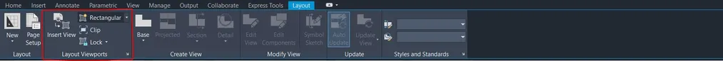 Dodanie nowej rzutni znajduje się w górnym panelu w zakładce Layout - Layout Viewports. Po wybraniu opcji Rectangular i narysowaniu prostokąta na kartce utworzy on odwołanie do modelu.
