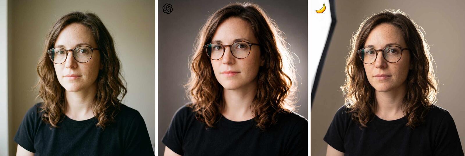 Niestety mamy ten sam problem co poprzednio. Mimo tego, że nasza prośba o zmianę oświetlenia została wykonana poprawnie, sama grafika została zmieniona, a kobiecie zmieniły się rysy twarzy. GPT ewidentnie zmienił jej charakter bardziej w stronę typowych postaci z AI - skóra stała się gładsza, rysy bardziej wyidealizowane. Nano Banana Pro ponownie wykonał zadanie perfekcyjnie - zmienił tylko oświetlenie, zachowując identyczne rysy twarzy i charakter portretu.
