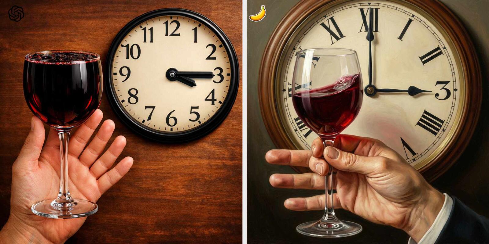W tym pojedynku możemy uznać, że wygrał GPT. Na trzy prośby udało mu się zrealizować dwie - wygenerował dłoń z 6 palcami oraz pełen kieliszek wina. Zegar niestety wskazuje złą godzinę. Grafika z Nano Banana Pro wygląda jak interesujący malarski obraz, natomiast z trzech próśb udało mu się zrealizować tylko jedną - ręka ma 6 palców. Kieliszek wina nie jest pełen i mimo tego, że zegar wskazuje godzinę 3, minuty nie są wskazywane poprawnie.