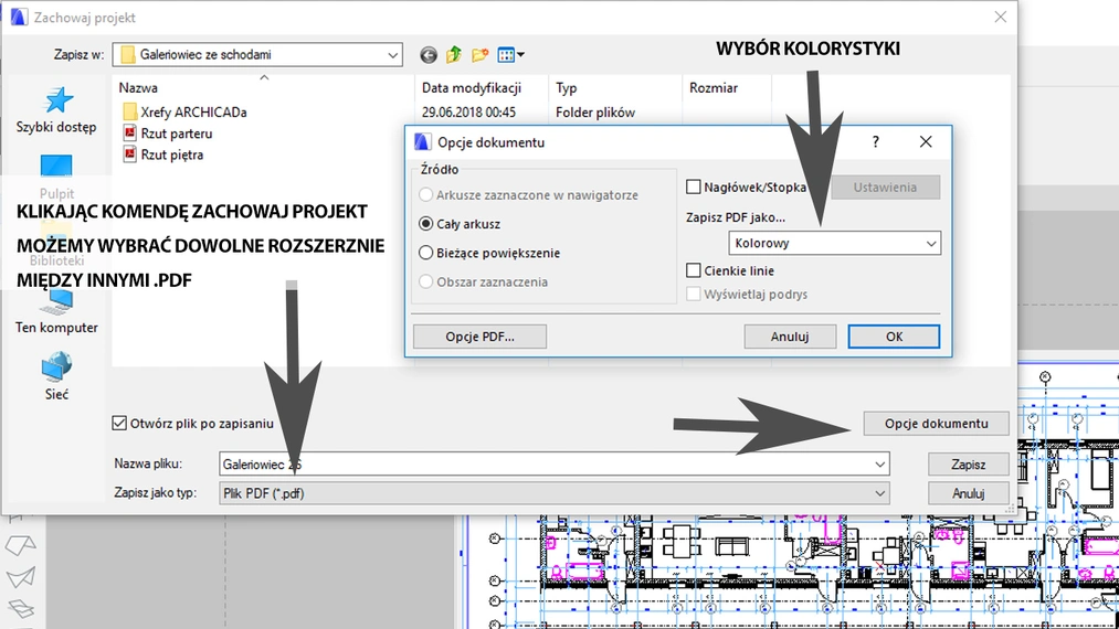 Zapisywanie pojedynczego arkusza kończymy (musimy być cały czas w oknie layotu wybraniem z lewej strony okna: zachowaj jako > wybieramy z formatów .pdf. Przed zapisaniem proponuję przejść jeszcze do okna opcje dokumentu. Możemy tam wybrać czy druk ma być czarno-biały lub kolorowy. Jeśli chcemy, aby w naszym pdfie znalazło się więcej rysunków wybieramy: arkusze zaznaczone w nawigatorze.