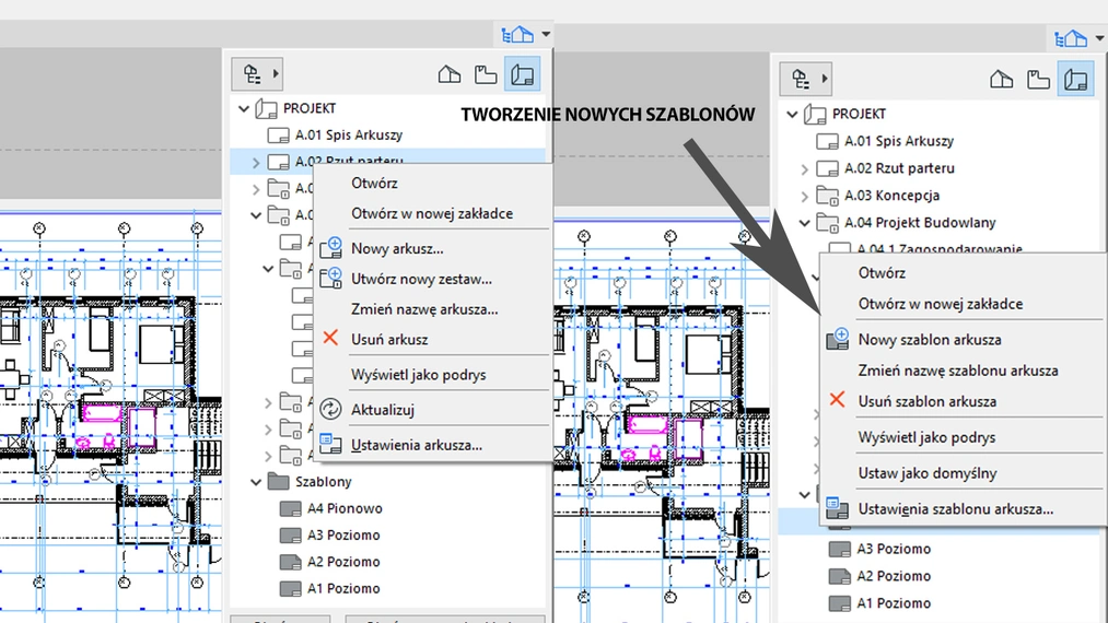 Klikamy prawym przyciskiem myszy w przestrzeni arkuszy. Wybieramy podpunkt nowy