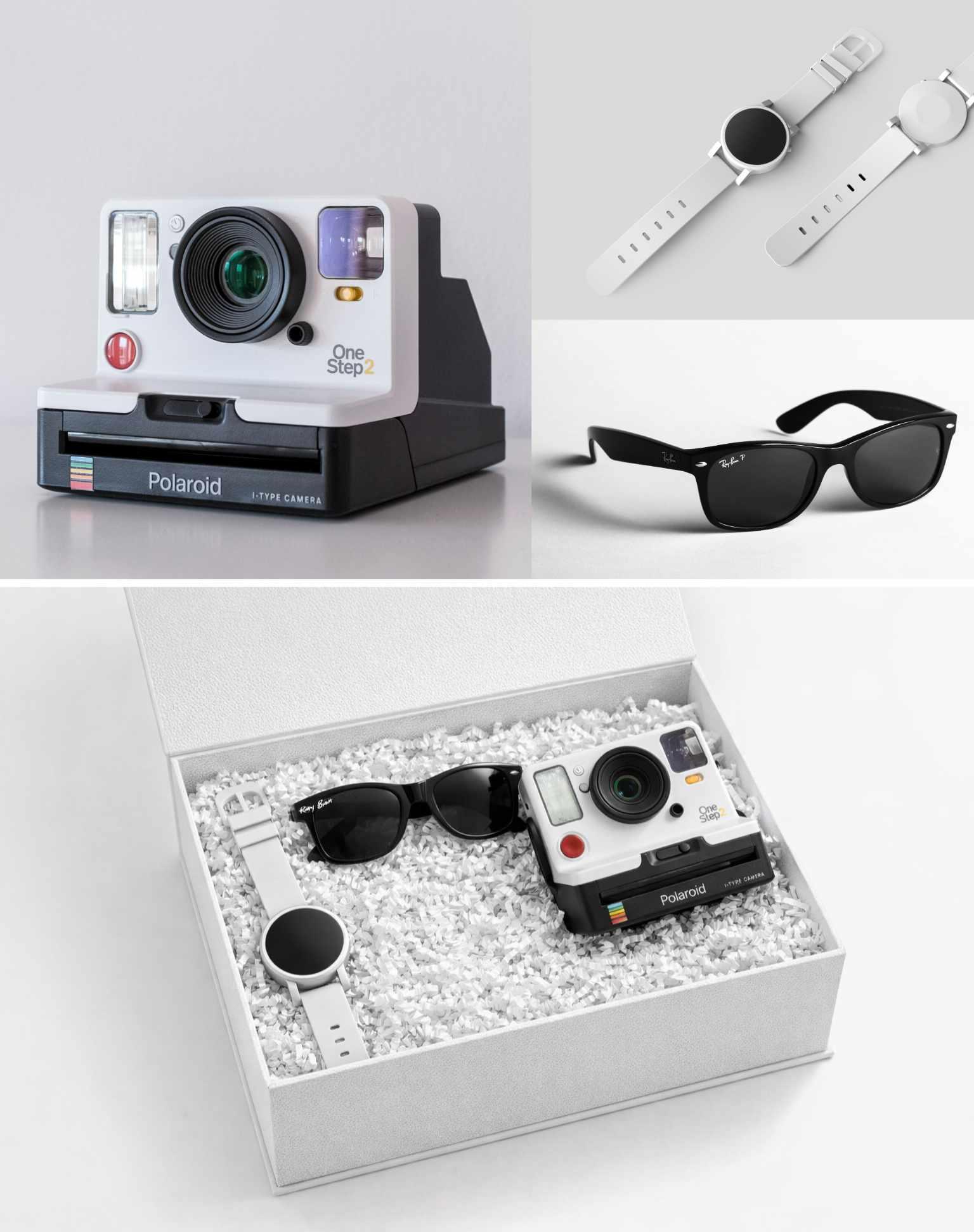 Czwarty test skupił się na praktycznym zastosowaniu w e-commerce - stworzeniu profesjonalnego zdjęcia produktowego. Zadanie brzmiało następująco: przygotuj eleganckie pudełko prezentowe zawierające trzy konkretne przedmioty - zegarek, okulary przeciwsłoneczne i aparat fotograficzny.