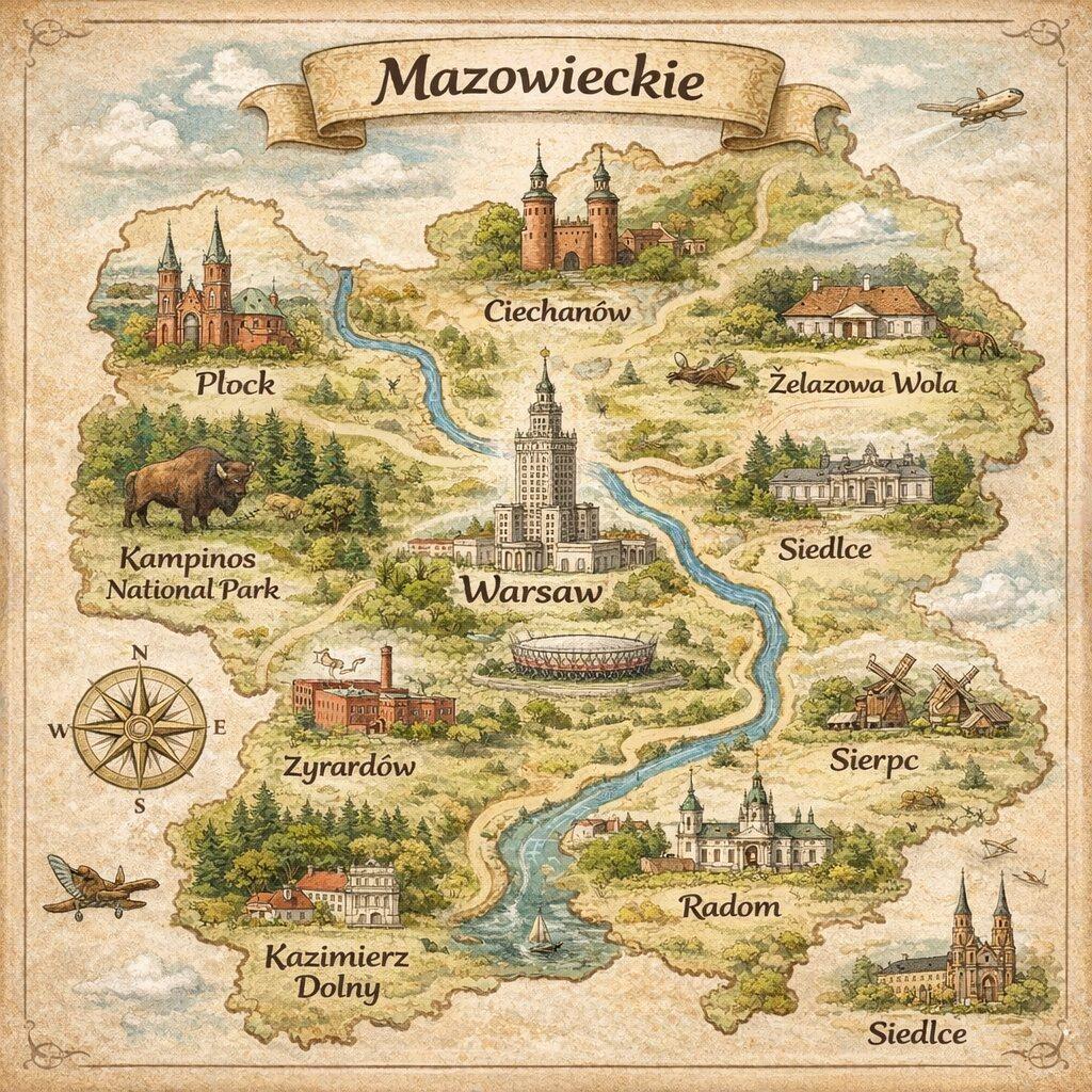 Siódmy test miał sprawdzić wiedzę geograficzną modelu. Zadanie było proste: wygeneruj mapę województwa mazowieckiego. Celowo nie dołączyłem żadnych materiałów referencyjnych - chciałem zobaczyć, czy GPT Image 1.5 ma w swojej bazie danych wystarczająco precyzyjne informacje o polskich regionach. Niestety, tutaj model wyraźnie się pogubił.