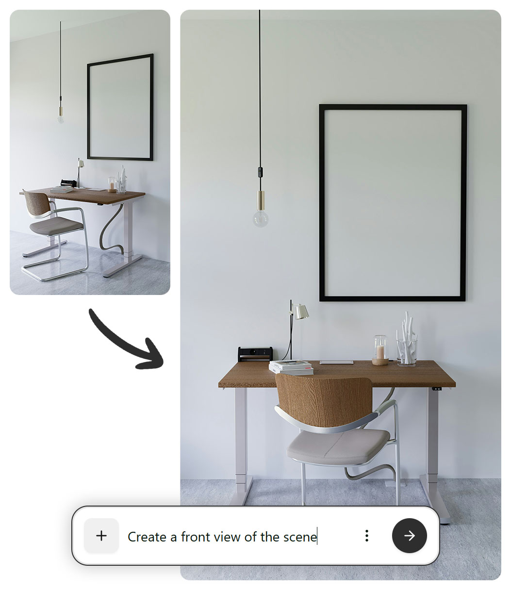 Modyfikacja aranżacji staje się kwestią kilku kliknięć. Rozbudowane tryby modelu pozwalają precyzyjnie korygować obraz krótkimi poleceniami, a visual cues (wskazówki w formie prostokątów) pomagają wskazać dokładnie, gdzie mają zajść zmiany. Cały proces jest iteracyjny: możesz poprawiać raz za razem, nie tracąc spójności.