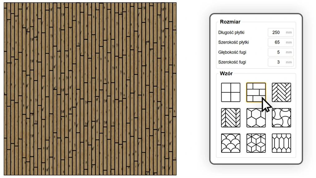 Prawdziwy kameleon wśród wzorów. Dzięki pełnej kontroli nad wymiarami i przesunięciem rzędów, jeden algorytm pozwala uzyskać skrajnie różne materiały. Ustawiając mały format i duże fazowanie, stworzysz kultową ścianę z kafelków typu "subway". Wydłużając element i zmieniając przesunięcie, uzyskasz klasyczną podłogę drewnianą lub wzór cegiełki okrętowej. Co więcej, włączając opcję losowego przesunięcia, zamienisz idealną posadzkę w rustykalny parkiet lub stary bruk, gdzie każda fuga wypada w innym, nieprzewidywalnym miejscu.