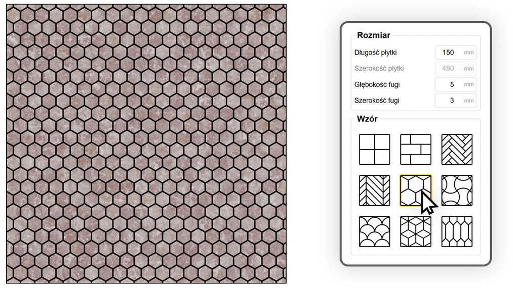 Geometryczny hit, który zdominował nowoczesne kuchnie i łazienki. Układ plastra miodu świetnie nadaje się do tworzenia modnych przejść między różnymi rodzajami posadzek (np. gres wchodzący w parkiet). Wykorzystując funkcję losowego obrotu tekstury, możesz sprawić, że każda płytka heksagonalna będzie wyglądała nieco inaczej, co doskonale imituje drogą, rzemieślniczą ceramikę.
