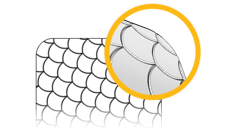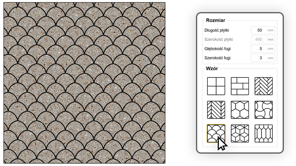 Organiczny, łukowaty kształt, który wprowadza do projektu miękkość i dekoracyjny charakter. Wzór ten, znany również jako rybia łuska, znajduje zastosowanie zarówno we wnętrzach jako ozdobna płytka ścienna (np. w kolorze butelkowej zieleni), jak i na zewnątrz, imitując klasyczną kostkę granitową ułożoną wachlarzowo na chodnikach.