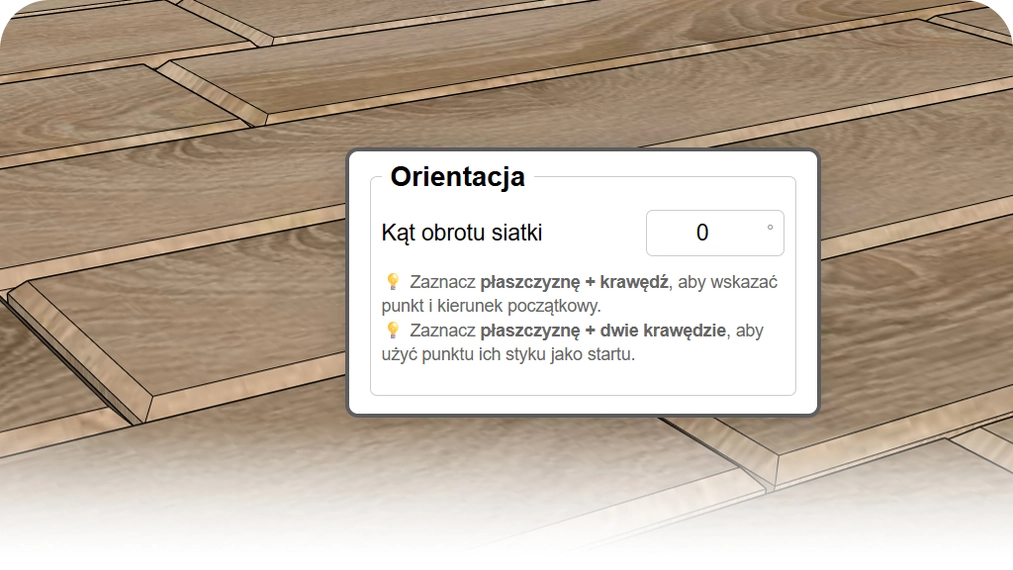 - Punkt startowy (2 krawędzie): To absolutny game-changer. Zaznacz płaszczyznę oraz dwie krawędzie, a wtyczka potraktuje ich styk jako punkt startowy generacji. Dzięki temu masz pewność, że w rogu pomieszczenia lub przy progu zacznie się pełna, ładna płytka, a nie przypadkowy ścinek.